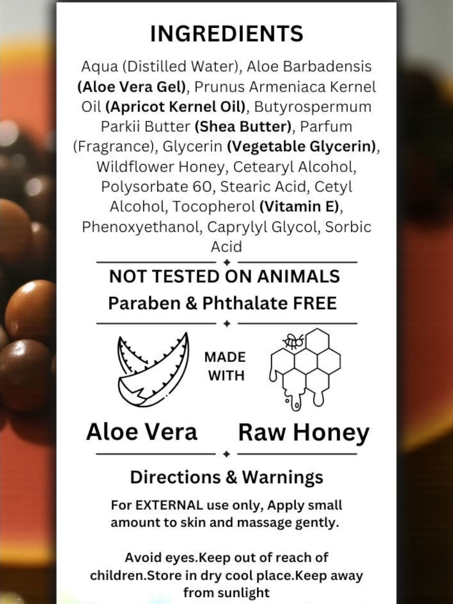 Ingredients: Distilled water (Aqua,Eau), Aloe Vera gel, Apricot kernel oil, Fragrance oil, Shea butter, Vegetable glycerin, Wildflower honey, Emulsifing wax NF(polysorbate 60, polawax 80), Stearic acid, Cetyl alcohol, Vitamin E (tocopherol), (phenoxyethanol, caprylyl glycol)