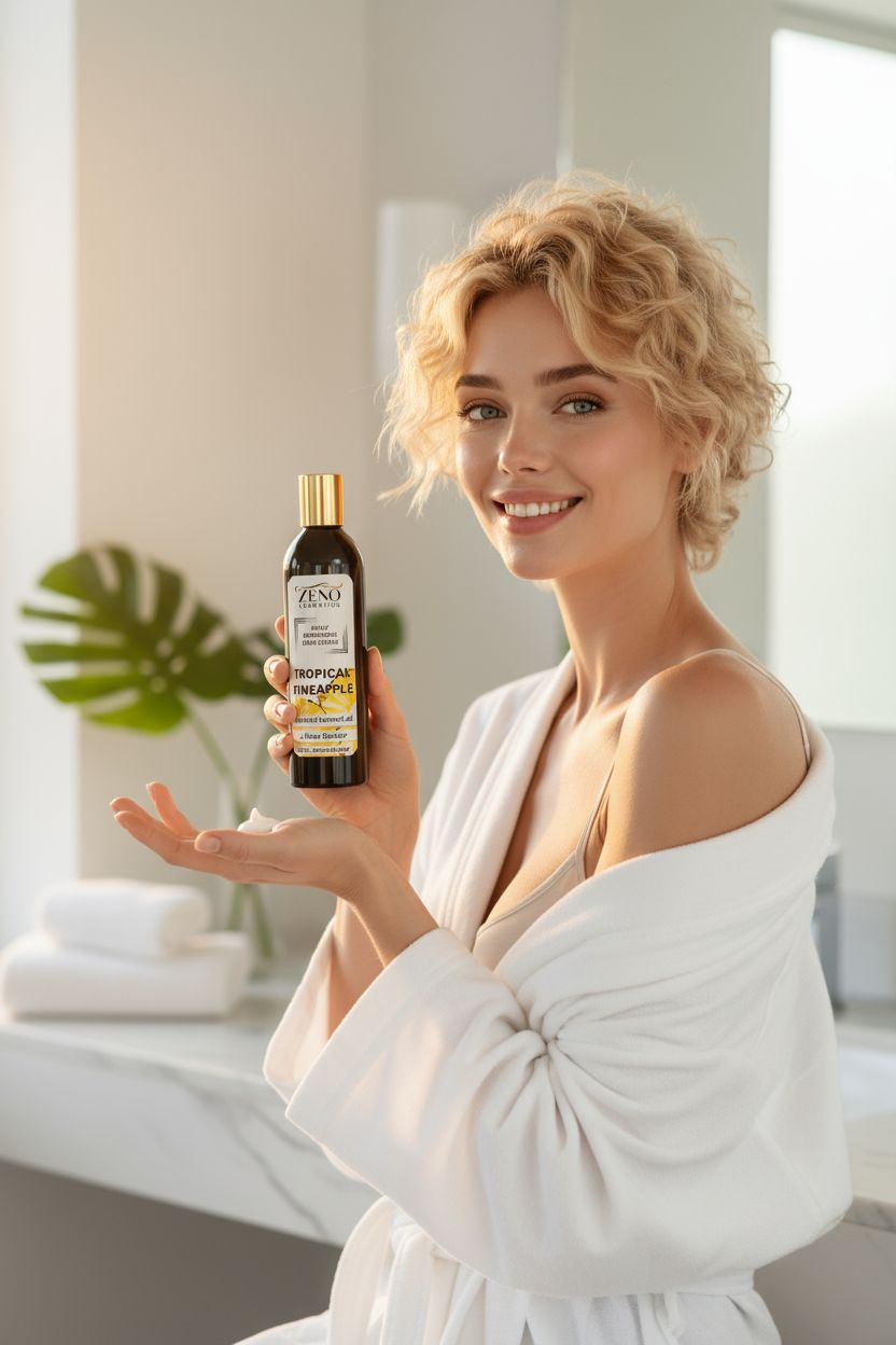 Our Pineapple Body Lotion delivers a splash of tropical hydration that leaves your skin silky smooth, glowing, and kissed by sunshine. Packed with nourishing Apricot kernel oil, soothing Aloe Vera, antioxidant-rich Vitamin E, and moisture-locking honey and vegetable glycerin, this lightweight lotion soaks in effortlessly, drenching your skin in rich, plant-powered goodness.